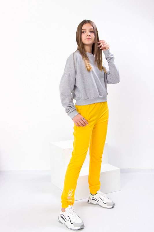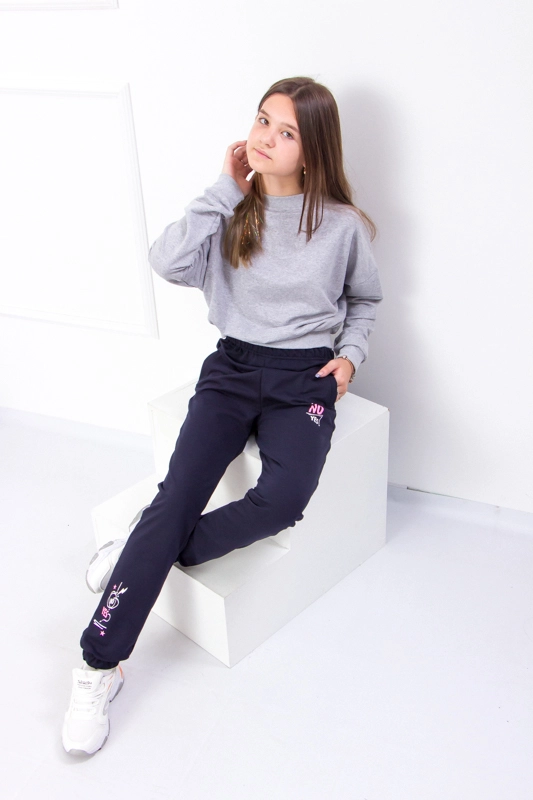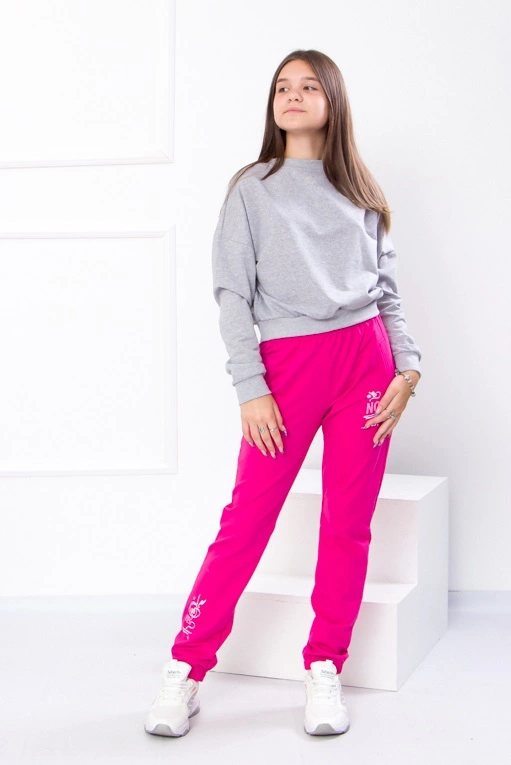 Модель виконана з полотна - двонитка. Трикотаж мало мнеться, відрізняється своїм повітрообміном. Пояс штанів та нижня частина на резинці. Штани доповнені кишенями для зручності. Модель прикрашена принтом. Спортивні штани відмінно підійдуть для занять фізкультурою, а також для активного відпочинку, поїздок на природу і для використання в якості домашнього одягу.