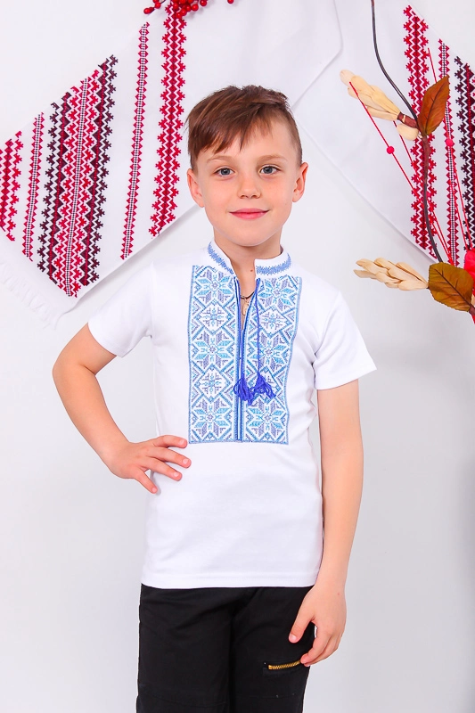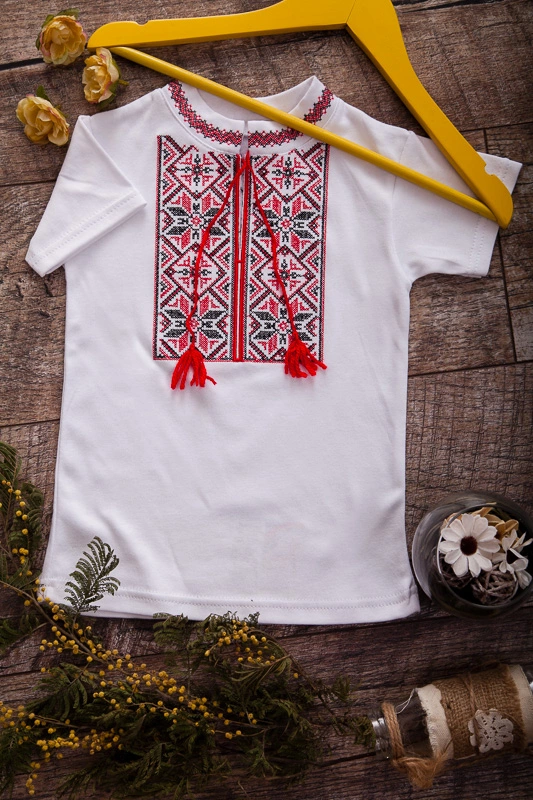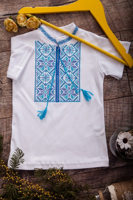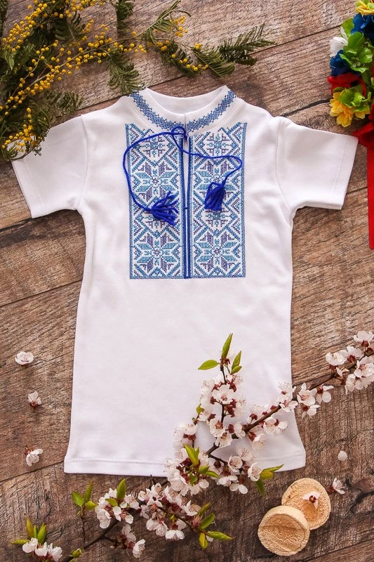 модних образів. Ошатна вишиванка для хлопчиків з коротким рукавом з білого інтерлока. Модель доповнена яскравими китицями-зав'язками та коміром-стійкою. Машинна вишивка хрестиком виконана на комірі і грудей виробу. Така модель практична - не деформується і не линяє після прання, а також відмінно сідає по тілу вашого малюка.